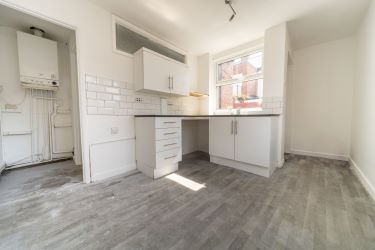Fitted wall and base units with work surfaces, single bowl drainer sink, electric cooker point, plumbing for washing machine, radiator, double-glazed windows to side and rear, and double-glazed rear door.