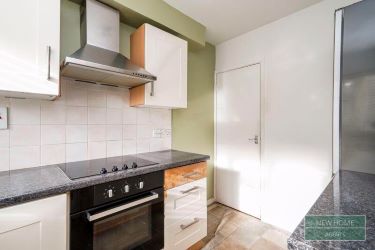 The kitchen is practical and well-appointed, comprising a range of wall and base units, an integrated electric oven and hob with extractor, and space for additional appliances, making it perfect for daily family meals or entertaining guests.